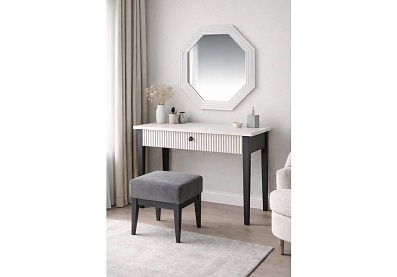 • Строгость линий и геометрически правильные формы мебели поддержаны контраcтным цветовым решением: чистый белый цвет каркаса и фасадов в сочетании с чёрной матовой фурнитурой и тёмно-серыми рамками фасадов.