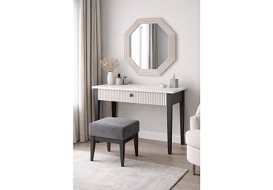 • Для хранения в спальне есть большой шкаф с зеркалом элегантного пепельного оттенка «графит», что придаёт дополнительный шарм коллекции;