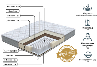 Матрас двухсторонний. Жесткость: выше средней с обеих сторон. В основе матраса 1000 независимых пружин на спальное место, точечно распределяющих нагрузку, обеспечивая комфортным и качественным сном. В составе комфортных слоев Ортофом в сочетании с Би-кокосом. Защитным слоем при их взаимодействии с независимыми пружинами служит спандбонд. По периметру матраса — усиленный короб, благодаря которому матрас обеспечивает необходимую поддержку при сидении. Чехол матраса выполнен из трикотажной ткани, простеганный на дополнительном слое Ортофом. Гарантия фабрики-производителя составляет 18 месяцев.