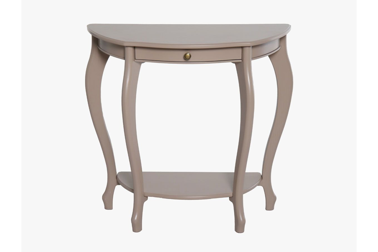 Столешница полукруглой формы выполнена из прочного, износостойкого МДФ, основание — из натуральной древесины. Лакированное глянцевое покрытие смотрится изысканно и благородно, фигурные ножки подчеркивают элегантность изделия. Широкий выдвижной ящик снабжен точечной круглой ручкой, декорированной «под золото».